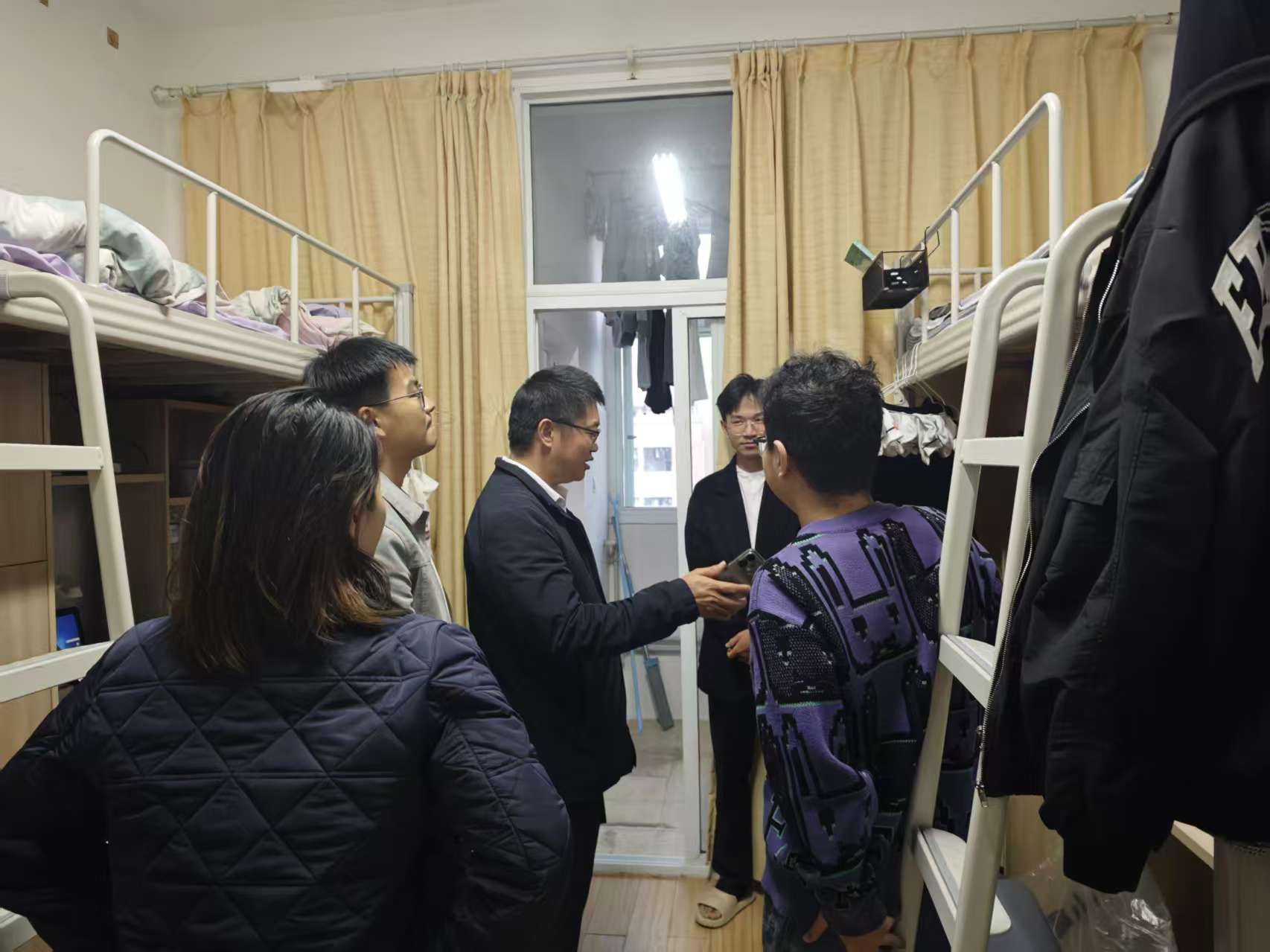 在隐患排查环节,由研究生院负责人钱长江带队,会同辅导员万正、蹇登绯及宿管人员深入学生宿舍,重点检查违规电器、电器运行状态及卫生情况。对发现的安全隐患,检查人员现场予以纠正并进行安全教育,做到立查立改、防患于未然。