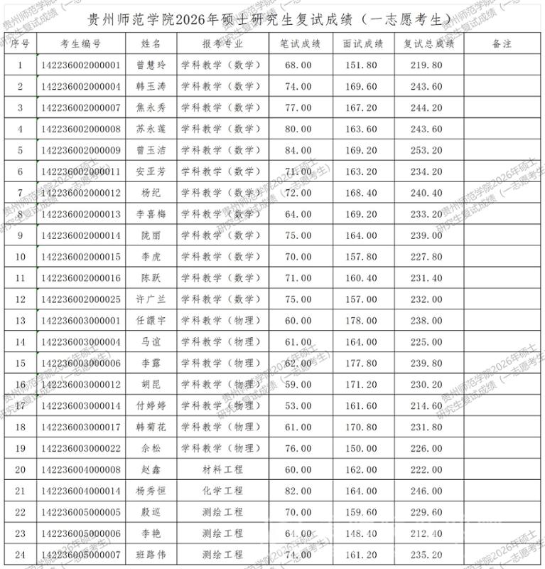 贵州师范学院2026年硕士研究生复试成绩(一志愿考生)